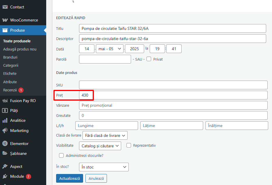 În WooCommerce există două tipuri principale de prețuri: Preț normal (Regular price) Preț redus (Sale price) Este important să înțelegi diferența dintre ele înainte să faci modificări. 1. Diferența dintre Preț normal și Preț redus Preț normal (Regular price) Este prețul standard al produsului Se afișează simplu, fără tăieturi Exemplu:100 lei Preț redus (Sale price) […]